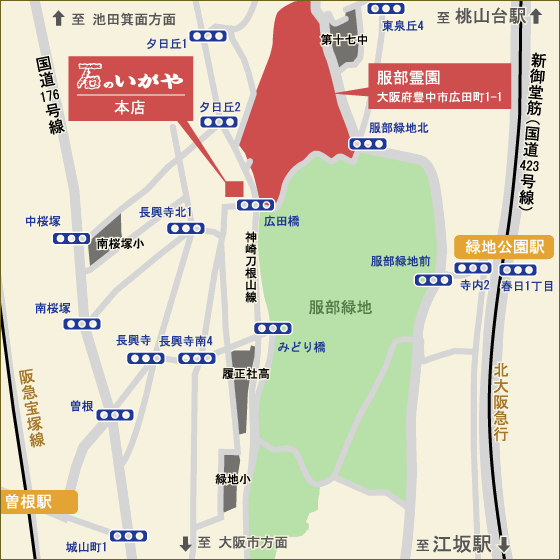 西出口を出て直進、服部緑地の中を通りぬけて、みどり橋を右折(北方 向へ)し、広田橋をこえて約100m。阪急宝塚線 曽根駅下車 徒歩約30分