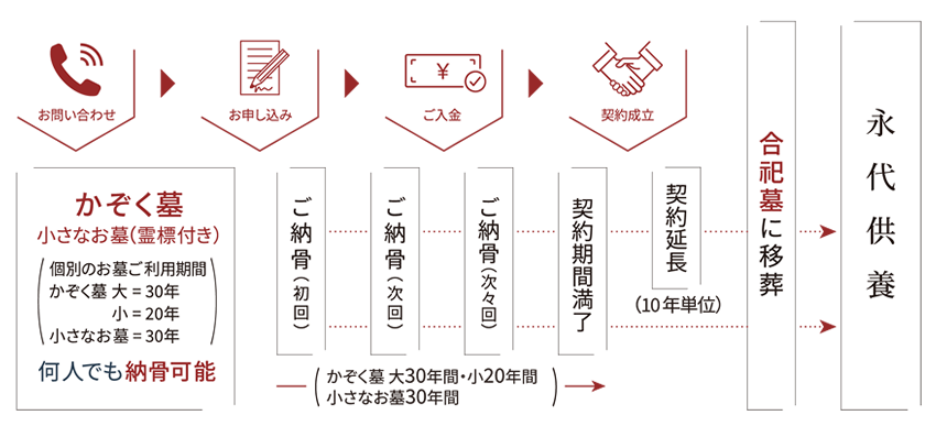 ご契約期間内は、個別のお墓にご納骨いたします。すぐには合祀いたしません。